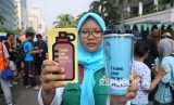 Aktivis menunjukan stiker dan tempat minum saat aksi Dukung Indonesia Bebas Sampah di Bundaran HI, Jakarta, Ahad (26/2). (FOTO : Republika/Agung Supriyanto)