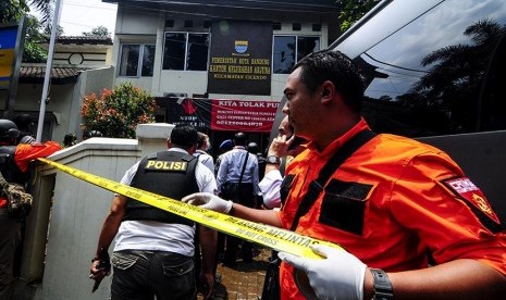 Anggota Brimob berjaga mengamankan Kantor Kelurahan Arjuna, Pasca pelaku peledakan dibawa menggunakan Ambulance, Jalan Ajuna, Kota Bandung, Senin (27/2). (FOTO : Mahmud Muhyidin)