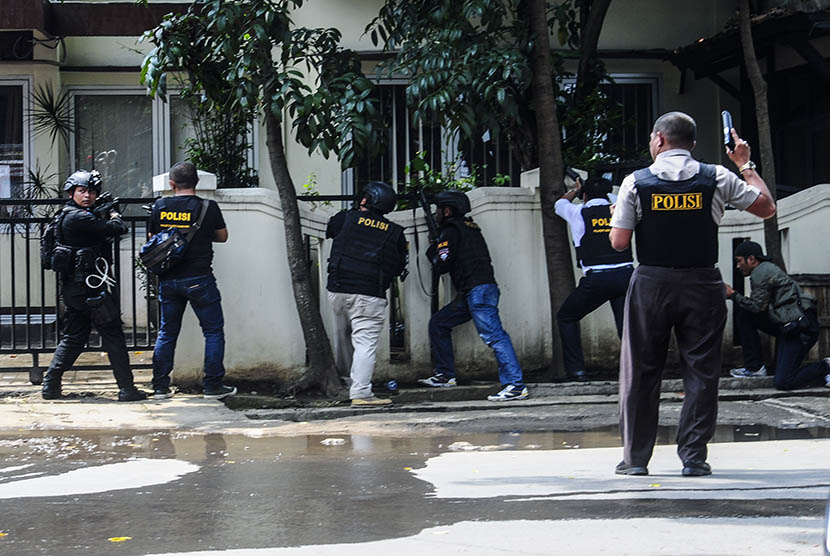 Petugas kepolisian bersenjata lengkap berusaha melumpuhkan terduga teroris di Kantor Kelurahan Arjuna, Bandung, Jawa Barat, Senin (27/2). (FOTO : Antara/Novrian Arbi)