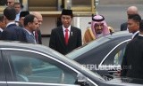 Presiden Joko Widodo (kiri) menyambut Raja Arab Saudi Salman bin Abdulaziz Al Saud saat mendarat di Bandara Halim Perdanakusuma, Jakarta, Rabu (1/3). (FOTO : Republika/Edwin Dwi Putranto)