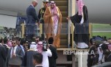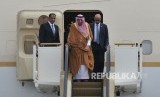 Raja Arab Saudi Salman bin Abdulaziz Al Saud keluar dari pesawat saat mendarat di Bandara Halim Perdanakusuma, Jakarta, Rabu (1/3). (FOTO : Republika/Edwin Dwi Putranto)