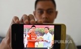 Mantan pesepak bola Persibat Batang Hapidin (25) menunjukan foto di telepon selularnya saat ketika ia menerima piala sepatu emasnya kepada wartwan di Surabaya, Jawa Timur, Rabu (1/3). Piala sepatu emas yang diperoleh ketika menjadi pencetak gol terbanyak (FOTO : M Risyal Hidayat/Antara)