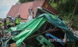 Petugas Kepolisian memeriksa kondisi truk kontainer yang ringsek akibat kecelakaan lalu lintas di jalur linkar kota kawasan Gondang Rejo, Karanganyar, Jawa Tengah, Rabu (1/3). Kecelakaan beruntun yang melibatkan tiga truk tersebut mengakibatkan supir truk (FOTO : Mohamad Ayudha/Antara)