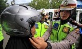 Petugas kepolisian Polres Lhokseumawe memakaikan helm yang dibagikan secara gratis kepada pelanggar lalu lintas saat Operasi Simpatik Rencong 2017 di Lhokseumawe, Aceh, Rabu (1/3). Operasi Simpatik yang berlangsung pada 1-21 Maret 2017 tersebut bertujuan u (FOTO : Rahmad/Antara)