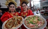 Sejumlah perempuan memperkenalkan Pizza Italia toping pisang ijo dan pisang epe di salah satu hotel di Makassar, Sulawesi Selatan, Rabu (1/3). Pizza dengan cita rasa makanan tradisional khas Makassar tersebut diharapkan dapat menarik minat pengunjung khusu (FOTO : Dewi Fajriani/Antara)