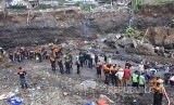 Sejumlah warga bersama relawan Banser, TNI dan polisi bergotong royong menormalisasi sungai Brangkongan di Ngesrep, Parakan, Temanggung, Jateng, Rabu (1/3). Kegiatan normalisasi sungai yang dilakukan oleh ratusan warga pasca bandir bandang (FOTO : Anis Efizudin/Antara)