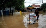 Pedagang melintasi banjir di Kawasan Bukit Duri, Jakarta, Rabu (8/3). (FOTO : Republika/Prayogi)