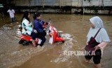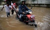 Pengendara sepeda motor berusaha melintasi banjir di Kawasan Bukit Duri, Jakarta, Rabu (8/3). (FOTO : Republika/Prayogi)