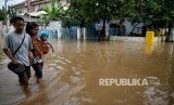 Warga melintasi banjir di Kawasan Bukit Duri, Jakarta, Rabu (8/3). (FOTO : Republika/Prayogi)