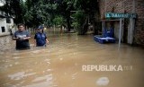 Warga melintasi banjir di Kawasan Bukit Duri, Jakarta, Rabu (8/3) (FOTO : Republika/Prayogi)