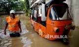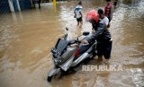 Warga membantu pengendara untuk melintasi banjir di Kawasan Bukit Duri, Jakarta, Rabu (8/3). (FOTO : Republika/Prayogi)
