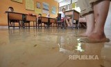 Beberapa pelajar SDN 83 Kota Jambi mengikuti kegiatan belajar mengajar di kelas sekolah mereka yang terendam banjir luapan Sungai Batanghari di Sejinjang, Jambi Timur, Jambi, Selasa (14/3). (FOTO : Wahdi Septiawan/Antara)