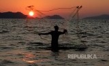 Nelayan menjala ikan menjelang matahari terbenam di pesisir Laut Ulee Lheu, Banda Aceh, Aceh, Selasa (14/3). (FOTO : Irwansyah Putra/Antara)