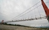 Sejumlah pekerja merampungkan pekerjaan pembuatan jembatan gantung di Desa Tinggede, Sigi, Sulawesi Tengah, Selasa (14/3). Jembatan gantung sepanjang 115 meter yang menghubungkan Desa Tinggede dan Kalukubula (FOTO : Basri Marzuki/Antara)