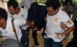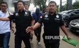 Petugas Sat Res Narkoba Polres Jakarta Barat membawa penyanyi dangdut Ridho Rhoma saat menjalani pemeriksaan di Balai Laboratorium Narkoba BNN, Jakarta, Senin (27/3). (FOTO : Republika/ Yasin Habibi)