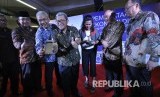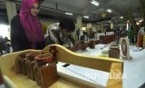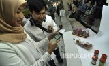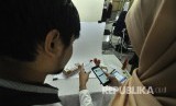 REPUBLIKA.CO.ID, BANDUNG -- Gubernur Jawa Barat Ahmad Heryawan memperlihatkan salah satu produk UMKM yang sudah diunggah didampingi pejabat terkait saat acara program gerakan meng-online-kan 100.000 UMKM di Pasar Ciroyom, Kota Bandung, Jumat (31/3).