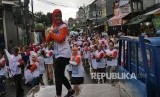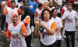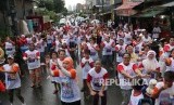 Warga bersama tim senam Sohib Anies Sandy melakukan senam bersama di Suka Mulia Jakarta Pusat, Ahad (2/4). (FOTO : Republika / Darmawan)