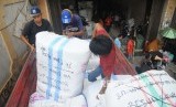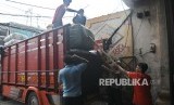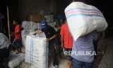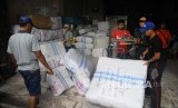 Pekerja mengangkat sejumlah paket yang akan dikirim keberbagai daerah di tempat pengiriman di Tanah Abang, Jakarta, Selasa (18/4). (FOTO : Republika/Agung Supriyanto)