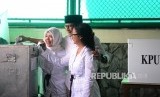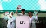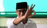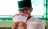 REPUBLIKA.CO.ID, JAKARTA -- Cawagub Sandiaga Uno bersama keluarga memberikan hak suaranya di TPS 01 kawasan Senayan, Jakarta, Rabu (19/4).