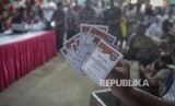 Petugas KPPS menghitung surat suara di TPS 29 Kelurahan Kalibata, Kecamatan Pancoran, yang melakukan Pemungutan Suara Ulang (PSU), Jakarta, Ahad (19/2). (FOTO : Republika/Raisan Al Farisi)