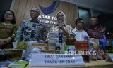 Kepala Badan POM RI, Penny Lukito (Hijab) memperlihatkan pangan, kosmetik, jamu dan obat tanpa ijin edar didampingi Kepala Badan POM Kota Bandung, Abdul Rahim dan pejabat terkait saat gelar ekspos di Kantor Badan Pengawasan Obat dan Makanan Kota Bandung, Jalan Pasteur, Jumat (21/4). (FOTO : Mahmud Muhyidin)
