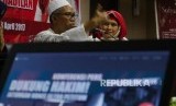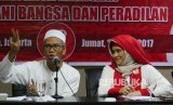 Ketua PP GIN (Gerakan Ibu Negeri) Neno Warisman (kanan) menyimak penjelasan dari Bun Yani yang mengunggah video pidato Ahok, pada acara konferensi pers di Jakarta, Jumat (28/4). (FOTO : Republika / Darmawan)