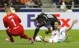 Kiper Lyon Anthony Lopes, dan bek Jeremy Morel berusaha mengadang pemain Ajax Bertrand Traore dalam pertandingan semifinal Europa League di Stadion Old Trafford, Jumat (12/5) dini hari. (FOTO : Laurent Cipriani/AP)