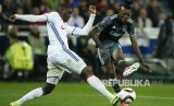 Pemain Lyon Mouctar Diakhaby (kiri) membayangi pemain Ajax Amsterdam Bertrand Traore (kanan) dalam pertandingan semifinal Europa League di Stadion Old Trafford, Jumat (12/5) dini hari. (FOTO : GUILLAUME HORCAJUELO)