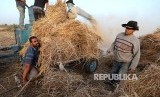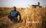 Louy Al-Najar membantu petani menggiling gandum yang baru dipanennya di ladang gandum Khan Younis Jalur Gaza selatan Ibraheem (FOTO : Ibraheem Abu Mustafa/Reuters)