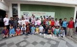 Penggagas Rumah Sains Indonesia Agustino Zulys berfoto bersama sejumlah peserta usai memberikan materi dasar kimia kepada siswa peserta dalam Republika Fun Science di Kantor Republika, Jakarta, Sabtu (13/5). (FOTO : Republika/Rakhmawaty La'lang)