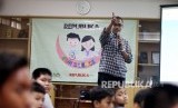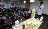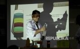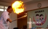 Penggagas Rumah Sains Indonesia Agustino Zulys memberikan materi dasar kimia kepada siswa peserta dalam Republika Fun Science di Kantor Republika, Jakarta, Sabtu (13/5). (FOTO : Republika/Rakhmawaty La'lang)