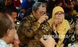 Gubernur Jabar Ahmad Heryawan beserta istri menikmati kopi pada acara "Ngopi Saraosna" di Halaman Gedung Sate, Kota Bandung, Sabtu (14/5). (FOTO : Republika/Edi Yusuf)