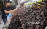 Pedagang menata buah kurma yang dijual di kawasan Pasar Tanah Abang, Jakarta, Selasa (16/5). (FOTO : Republika/Agung Supriyanto)