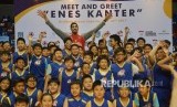 Pebasket penyerang tengah dari club OKC Thunder Enes Kanter berfoto bersama setelah memberikan materi kepada peserta coaching clinic saat acara meet and greet di Britama Arena, Jakarta, Kamis (18/5). (FOTO : Republika/Raisan Al Farisi)