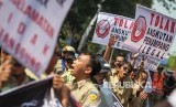 Pengemudi taksi melakukan aksi unjuk rasa menolak operasi angkutan penumpang ilegal di Solo, Jawa Tengah, Kamis (18/5). Aksi tersebut sebagai bentuk penolakan operasional angkutan umum bebasis aplikasi "online" Uber karena dinilai belum memiliki izin operasi dari pemerintah kota maupun provinsi. (FOTO : Mohammad Ayudha/Antara)