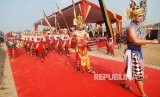 Sejumlah penari menampilkan tari kolosal saat kirab budaya di Lapangan Trowulan, Mojokerto, Jawa Timur, Minggu (14/5). Kirab budaya tersebut dalam rangka peringatan hari jadi ke-724 Kabupaten Mojokerto. (FOTO : Syaiful Arif/Antara)