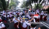 Sejumlah pelajar mengibarkan bendera untuk menyambut Raja dan Ratu Swedia di Istana Bogor, Kota Bogor, Jawa Barat, Senin (22/5). Pelajar dari seluruh sekolah di Kota Bogor antusias menyambut kedatangan Raja Carl XVI Gustaf dan Ratu Silvia dari Swedia ke Istana Bogor. (FOTO : Yulius Satria Wijaya/Antara)