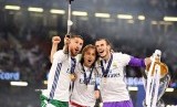 Sergio Ramos, Luka Modric and Gareth Bale berswafoto usai timnya memenangi Trofi Piala Champions League (FOTO : Peter Powell/EPA)