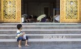 Seorang anak memperhatikan umat Islam shalat berjamaah di sebuah masjid di Denpasar. (FOTO : Made Nagi/EPA)