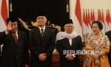 Anggota Dewan Pengarah Unit Kerja Presiden bidang Pembinaan Ideologi Pancasila (UKP-PIP) Said Aqil Siradj, Jenderal TNI (Purn) Try Sutrisno, Ma'ruf Amin, dan Megawati Soekarnoputri berfoto bersama usai pelantikan UKP-PIP di Istana Negara, Jakarta, Rabu (7/6) (FOTO : Republika/ Wihdan Hidayat)