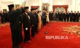 Sembilan anggota Unit Kerja Presiden bidang Pembinaan Ideologi Pancasila (UKP-PIP) melakukan pengambilan sumpah saat pelantikan di Istana Negara, Jakarta, Rabu (7/6). (FOTO : Republika/ Wihdan Hidayat)