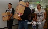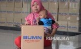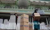 Warga membawa bingkisan Ramadan berupa sembako dari PT Pertamina di Masjid Al-Mukaromah, Jakarta Utara, Selasa (13/6). (FOTO : Republika/ Yasin Habibi)