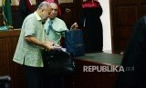 Terdakwa kasus dugaan suap judicial review di Mahkamah Konstitusi Patrialis Akbar meninggalkan ruangan usai mengikuti sidang perdana dengan agenda pembacaan dakwaan di Pengadilan Tipikor, Jakarta, Selasa (13/6). (FOTO : Republika/ Wihdan Hidayat)