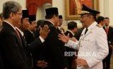 Djarot Saiful Hidayat menerima ucapan selamat dari Anggota DPR DKI Jakarta Lulung Lunggana usai pengambilan sumpah pada acara plantikan Gubernur DKI Jakarta oleh Presiden Joko Widodo di Istana Negara, Jakarta, Kamis (15/6). (FOTO : Republika/ Wihdan Hidayat)