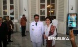 Gubernur DKI Jakarta Djarot Saiful Hidayat dan sang istri Happy Farida tiba di Balai Kota usai pelantikan di Istana Negara, Kamis (15/6). (FOTO : Republika/ Noer Qomariah Kusunawardhani)