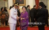Ketua Umum PDI Perjuangan Megawati Soekarno Putri memberikan ucapan selamat kepada Djarot Saiful Hidayat usai pengambilan sumpah pada acara plantikan Gubernur DKI Jakarta oleh Presiden Joko Widodo di Istana Negara, Jakarta, Kamis (15/6). (FOTO : Republika/ Wihdan Hidayat)