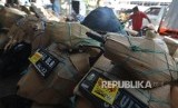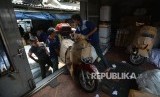 Pekerja merapikan kendaraan bermotor yang akan di kirim ke daerah di salah satu jasa pengiriman di Kawasan Pasar Senen, Kamis (15/6). (FOTO : Republika/Raisan Al Farisi)