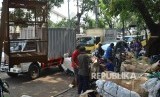 Pekerja memasukan kendaraan bermotor ke atas gerbong untuk di kirim ke daerah di salah satu jasa pengiriman di Kawasan Pasar Senen, Kamis (15/6). (FOTO : Republika/Raisan Al Farisi)