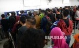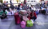 Pemudik melakukan check in di Stasiun Pasar Senen, Jakarta, Ahad (18/6). (FOTO : Republika/Wihdan Hidayat)
