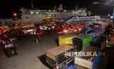 Kendaraan antre memasuki kapal Ro-Ro di Dermaga 3 Pelabuhan Merak, Banten, Kamis (22/6) malam. (FOTO : Republika/Wihdan Hidayat)